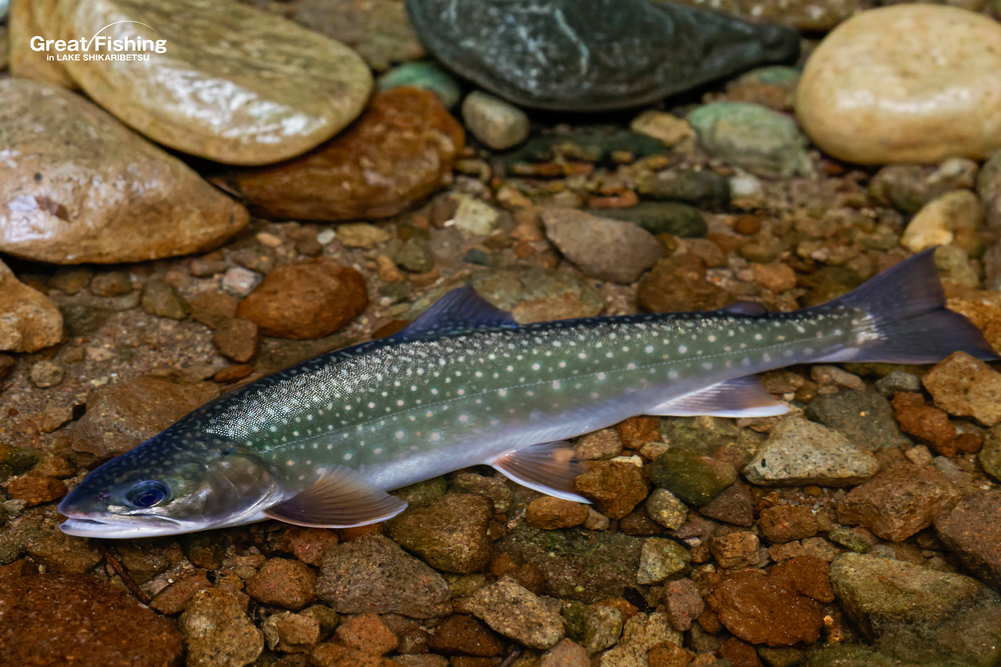 湖中央周辺㉓㉔でスプーン10g(緑)を50秒沈めて水深10mでミヤベイワナ(32㎝、35㎝)2匹ヒット(因さん/札幌市)。