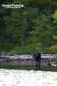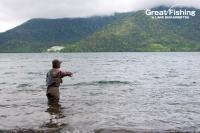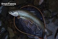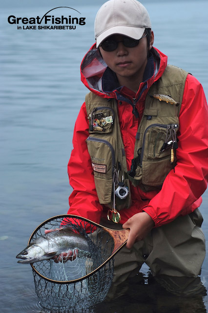 連日大型のミヤベイワナが釣れています。釣れるミヤベイワナのカラーは岸近くではブラウンバックが多く、岸から離れるにしたがいグリーンバックが多いようです。40cmを超えるミヤベイワナはドリーバーデンの様な風格と美しさがあり釣り人の心を惹きつけます。ミヤベイワナのヒットゾーンは水深5〜15mと各ポイントごとに違います。湖中央では10〜15mラインが良く、かけ上がり付近では5〜10mラインが良く釣れています。ニジマス(40〜50cm)は岬周辺かけ上がり水深2〜5mでヒットしています。ニジマス狙いではフライ(ストリーマー)をシンキングラインタイプ4〜6で岬周辺をハーリングすれば効果的。岸釣りのキャスティングではサクラマス(30〜40cm)、ニジマス(30〜52cm)も釣れています。