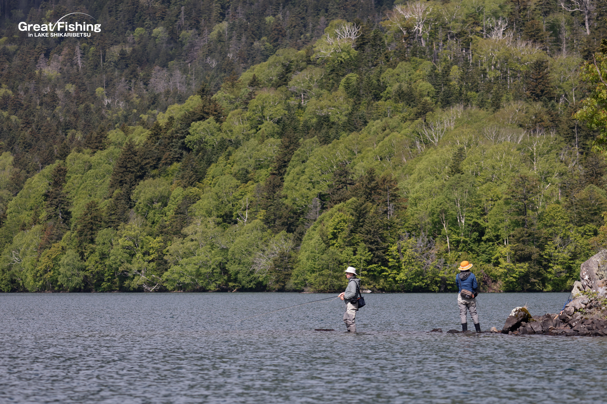 1の湾⑲で大型ニジマス(55cm)、2の湾⑰で大型ニジマス(40cm)、湖中央㉓では大型ミヤベイワナ(40cm)が(シンキングラインタイプ4+#8ウーリーバガー/ブラック)をゆっくりハーリングしてヒット、(林さんペア/札幌市)。唐沢湾岸釣りエリアでは大型ニジマス(50cm)が(プリンスニンフ)でヒット(星野さん/札幌市)ほか。