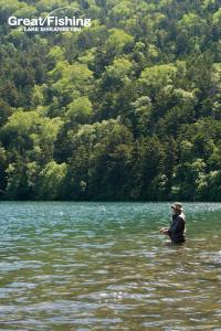 ニジマス狙いの場合、ポイントで待機しライズを待つか、移動しながらライズを見つけること。ライズがある場合、数匹のニジマスが岸寄りし、水面に浮かぶ昆虫類を探しながらクルージングしています。岸釣りの場合はウェーディングはできるだけ浅くするか、立ち込まないように。また、ハッチがある場合、魚たちはセレクティブになっています。できるだけフライをマッチさせた方がヒットします。ライズが無い場合は、大きく目立つ大型ドライフライ(セミ、マドラーミノー)などが有効。湖の透明度が高いので、サイトフィッシングも可能です。