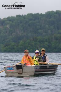 ミヤベイワナ(20〜35cm)のほとんどは(7〜10m)の深場でヒットしていますが、かなり難しい釣りになっています。今日の最高釣果は14匹(小原さん/札幌市)。ヒットするポイントは、1の湾、湖中央、虹色岬沖、音更湾中央など。