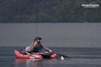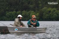 べた凪のポイントでは、ボートからフライまでの距離は15〜20m。風が吹き、湖面にさざ波が立っているポイントの場合は、10m以内でもヒットしています。ボートで効率良くニジマスを狙う方法は、風上から風下へボートが流されるポジションを取り、岸からの距離(10〜15m)を保つように操船ししながら、約5m間隔にドライフライを岸際2m以内へキャストします。パイロットフライは、#8〜#10エルクヘヤーカディスまたはテレストリアル。反応が無い場合は、#12〜#14へサイズダウン。リーダー・ティペットは(3X〜4X)。ヒットさせるために一番大事なことは、一呼吸置いた「遅合わせ」。