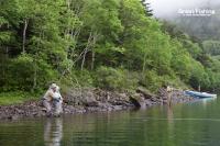 大型ニジマスのライズは少なく、ブラインドでドライフライを岸際へキャストしても、反応が渋いようでした。(シンキングラインタイプ4)+(チューブフライ/ストリーマー)で、大型ニジマス(51cm)がヒット、ドライフライ(#10エルクヘヤーカディス)で、ニジマス(24〜32cm)がヒット(長谷川さん/長野県)。(フローティングライン/シンクティップタイプ3)+(ビーズヘッドニンフ)で、ニジマス(43〜46cm)がヒット、ミヤベイワナ(34cm)もで釣れています(佐藤さん/音更町)。ルースニング(#10ビーズヘッドニンフ)で、ニジマス(25〜46cm)7匹、サクラマス(20〜35cm)2匹がヒット(高橋さん/鹿追町)。ヒットポイントは、湯ノ花岬周辺ポイント⑭ 。