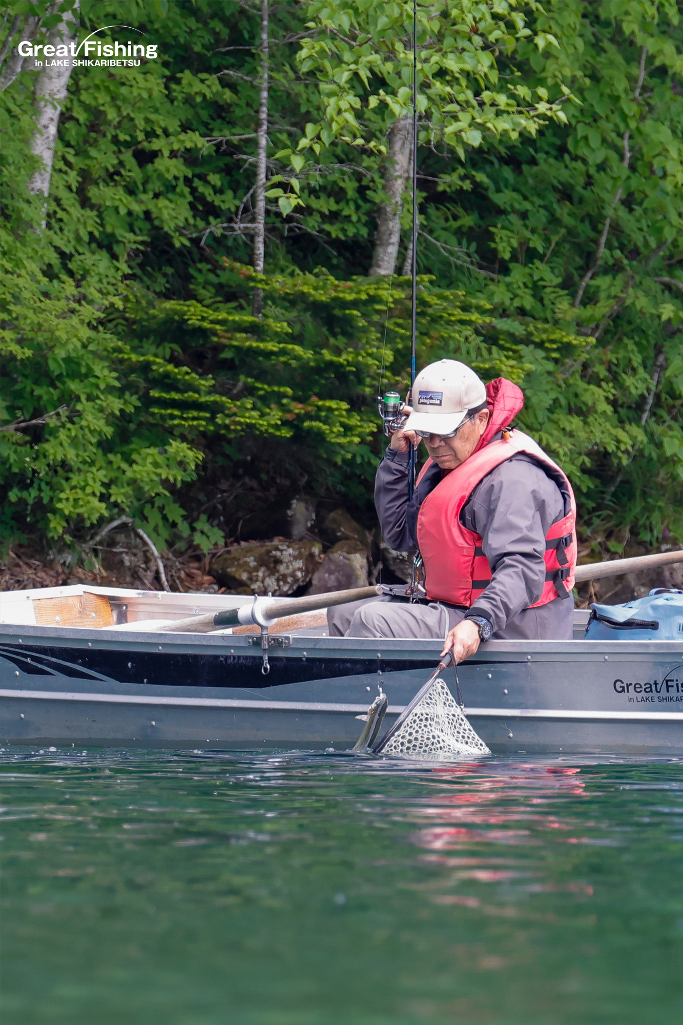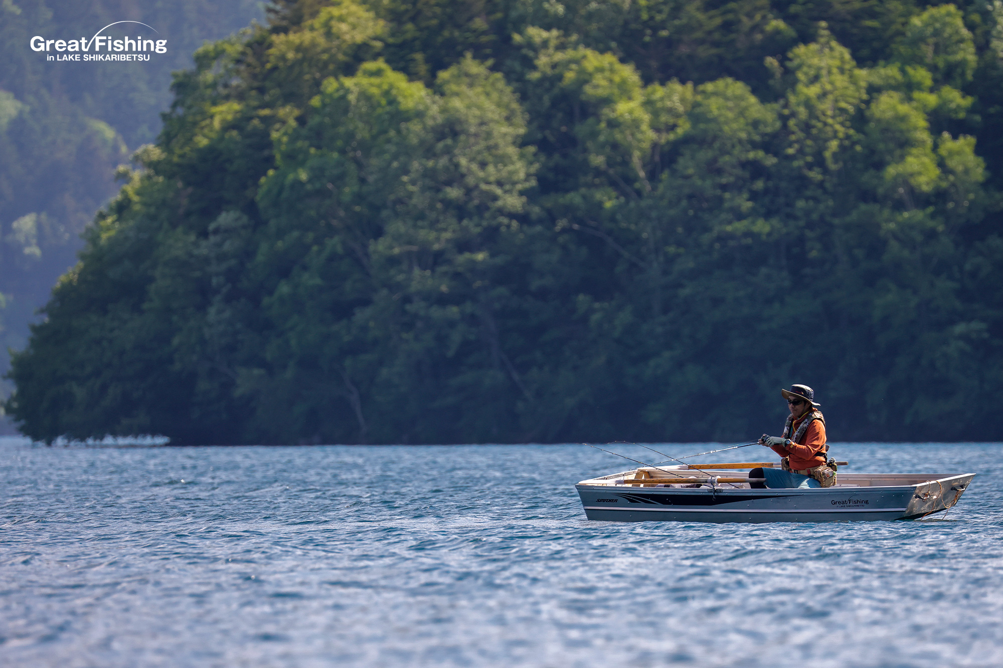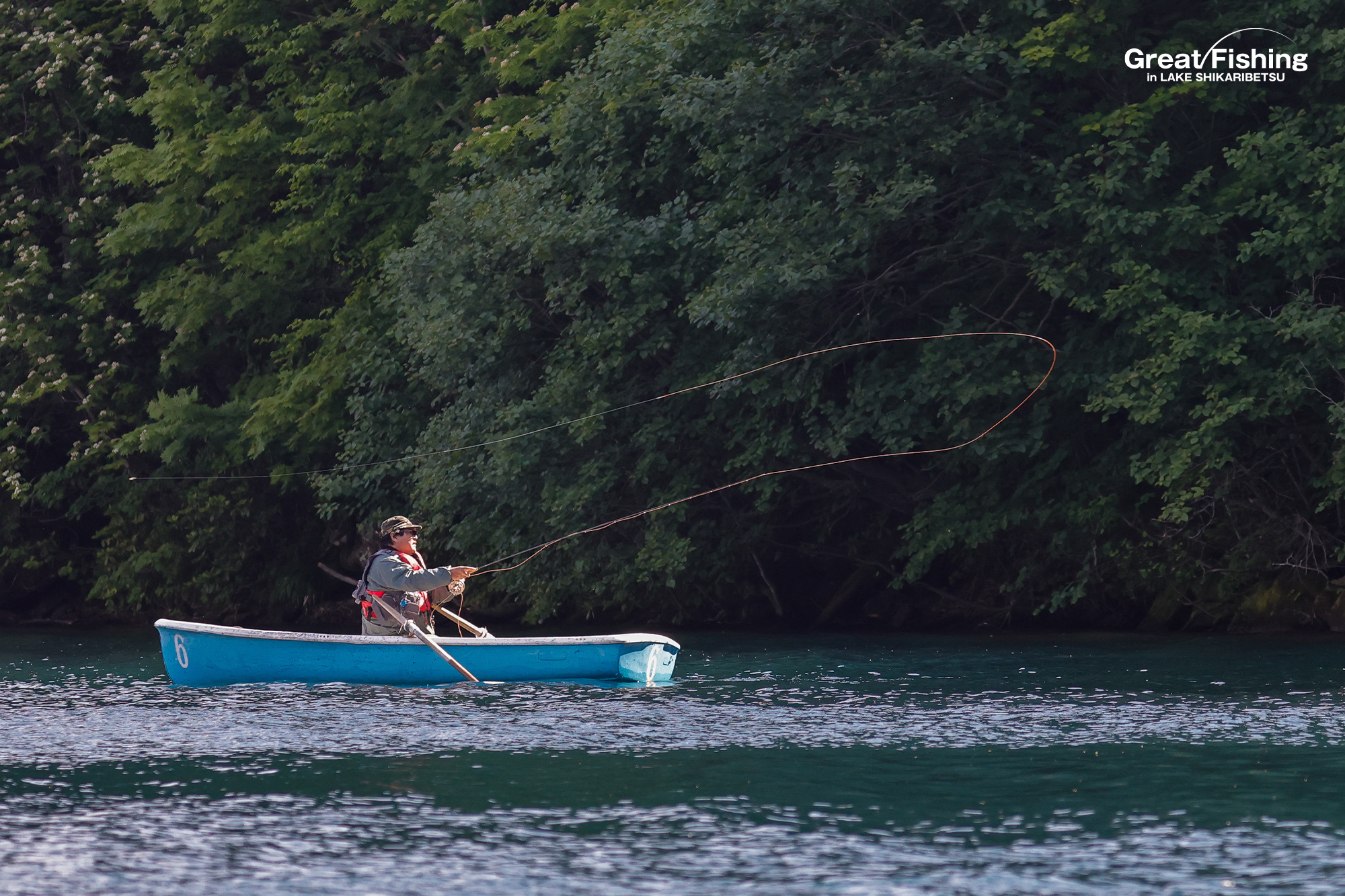 湖中央周辺㉓で、ミヤベイワナ(25〜28cm)4匹、サクラマス(25〜35cm)19匹、回遊型の大型ニジマス(42cm、44cm)2匹が(シンキングラインタイプ6+ストリーマー)でヒット、午後2時頃から思い出岬⑱で複数ライズがあり、ドライフライ(#12ライツロイヤル)で、ニジマス(30〜35cm)6匹ヒット(長嶋さん/横須賀市)。シャクナゲ岬⑦で、ミヤベイワナ(30cm)2匹、更湾南側岸周辺⑧で、ニジマス(38cm)1匹ヒット(平尾さん/網走市)、ヒットルアーはスプーン13g(金)、カウントダウン30〜40秒。