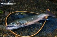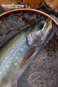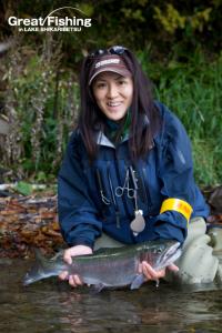 今日は曇りから次第に小雨に変わり、午後になっても気温は10℃と寒い一日になりました。ミヤベイワナ(20〜46cm)が湖中央[18][19][20]、取水口周辺[17]で良く釣れています。1〜3mの浅い水深でヒットするタイプは(20〜35cm)。7m〜10mの深場では(40〜46cm)の大型のミヤベイワナが少数ですが釣れています。ボート移動中のトローリングでは、ミヤベイワナの群れに当たると数多くのヒットがあり。岸周辺の掛け上がりでは、サクラマス(20〜30cm)が連日良く釣れています。全体の釣果は一人(0〜5匹)今日最高の釣果は23匹(岡元さん/愛知県)
