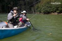 ドライフライのヒットは(岸際〜3m以内)が最も多く、ライズが無いときには、大きめのフライ、ライズが始まったらサイズを小さくすると良いようです。ニジマスが捕食しているのは(#18ケバエ、#20アワフキムシ)など極小陸生昆虫。ドライフライでニジマスを狙う場合は、フライロッドは#5〜#6シングルハンド(8〜9フィート)、リーダー&ティペットは3X〜5X(12〜16フィート)。