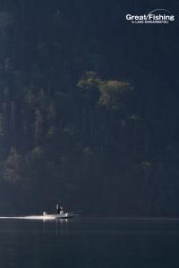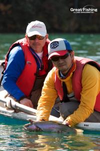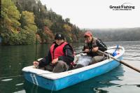 湖水の透明度は(水深13m)でとてもクリアで、深いレンジ(10m〜14m)でヒットするミヤベイワナの体色は、美しい「ブルーバック」。サイズは(22〜40cm)でコンディションもとても良いようです。