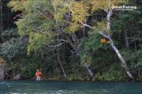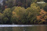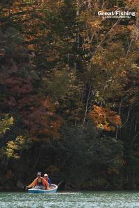⑭ 湯ノ花岬周辺では、大型ニジマス(50cm)がスピナー5gでヒット(神谷さん/旭川市)。⑥ シャクナゲ岬周辺ではドライフライ(#16〜18テレストリアル)で(40cm)1匹、(47cm)2匹ヒット(下田さん/長崎県)。⑮ 思い出岬周辺、⑭ 湯ノ花岬周辺、② 砂場ワンド周辺では、(32cm)2匹、(43〜49cm)4匹ヒット(魚矢さん/宮崎県)ほか。