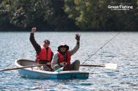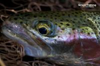 うぐいす湾では、大型ニジマス(47cm)がドライフライ(#11ロイヤルコーチマン)でヒット(下口さん/長崎県)、大型ニジマス(47cm)がニンフ(#16フェザントテイル)でヒット(森さん/熊本県)。⑮ 思い出岬では、大型ニジマス(48cm)がドライフライ(#12ビートル)でヒット(魚矢さん/宮崎県)。