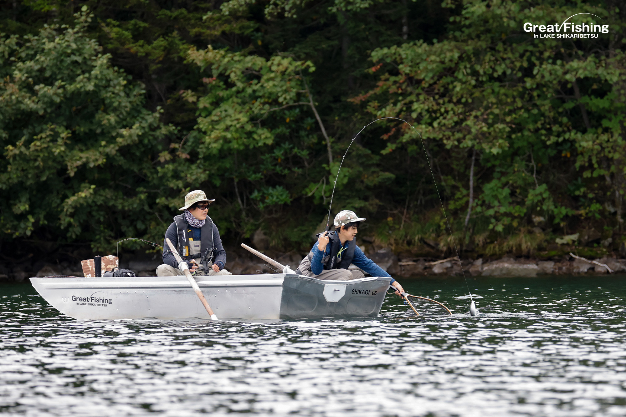 ミヤベイワナのヒットレンジは非常に深く水深(12〜15m)。湖中央、境界線周辺を丁寧にトローリングして(25〜35cm)が21匹。サクラマスは水深(2〜3m)で46匹ヒット(宮村さん/帯広市)。2の湾の沖㉒の水深(10〜15m)でミヤベイワナ(24〜30cm)10匹ヒット(伊藤さん/札幌市)。1の湾の沖から2の湾の沖㉒周辺でミヤベイワナ(30〜40cm)の反応が多くあるようです(吉田さん/札幌市)ほか。