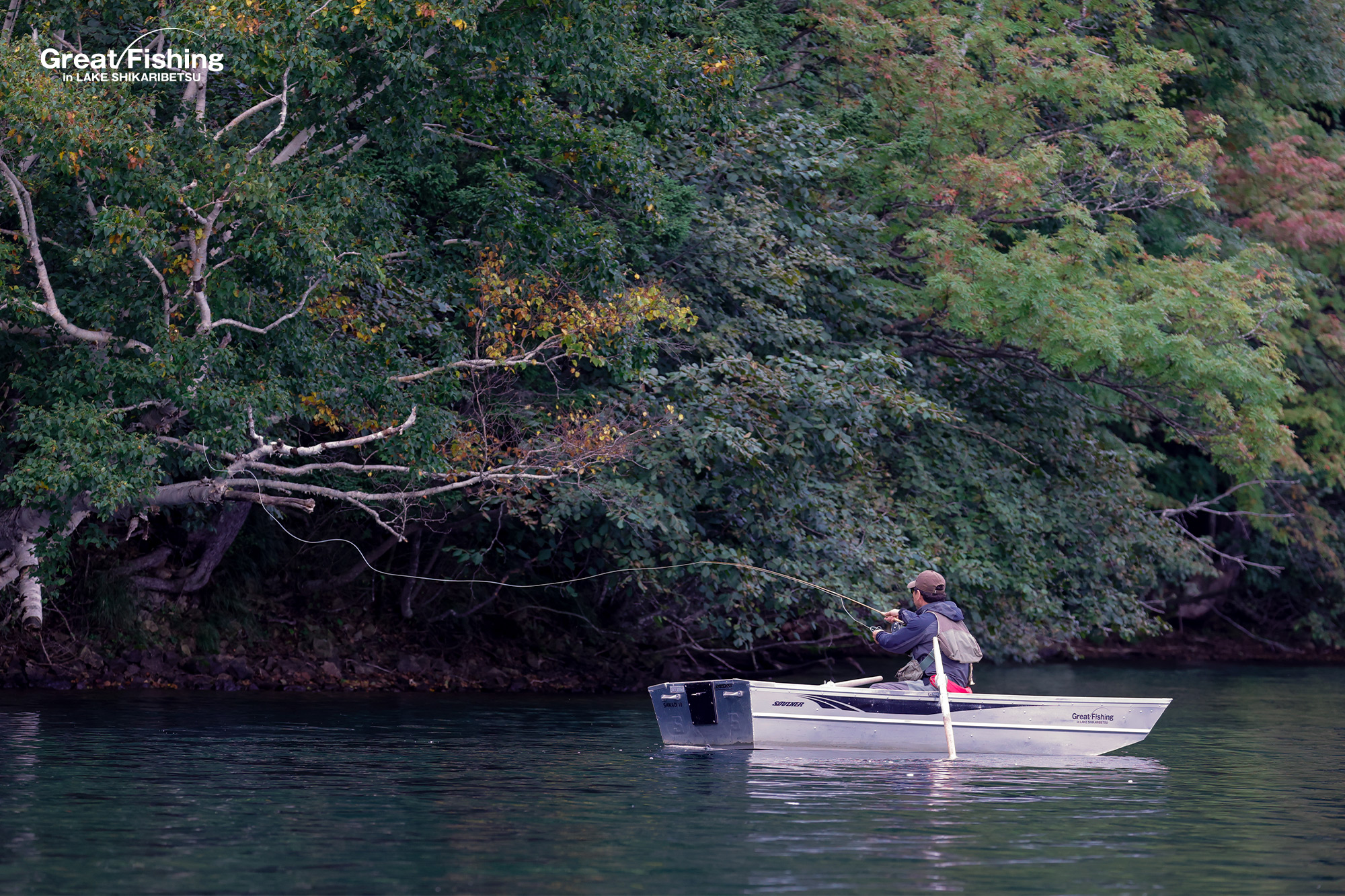 唐沢湾岸釣りエリアでは、ドライフライ(#8エルクヘヤーカディス)で大型ニジマス(46cm)がヒット(中山さん/東京都)。