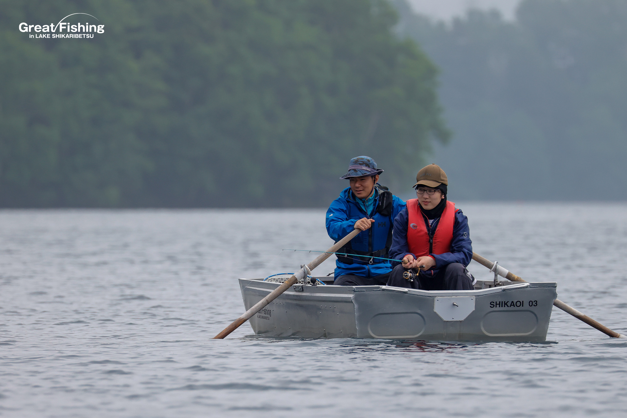 境界線中央㉕周辺、湖中央㉓周辺で、ミヤベイワナ(30~35㎝)6匹ヒット(赤岩さん/徳島県)、ヒットルアーはスプーン28g、水深10m前後。うぐいす湾奥④、カルガモ岬⑤で、大型ニジマス(35~45㎝)4匹がドライフライ(グラスホッパー、アント)にヒット(三坂さん/札幌市)、虹色岬③で、ニジマス(30~43㎝)3匹、サクラマス(25㎝)4匹がスプーン(5~9g)、かけ上がりでヒット(大沼さん/芽室町)。