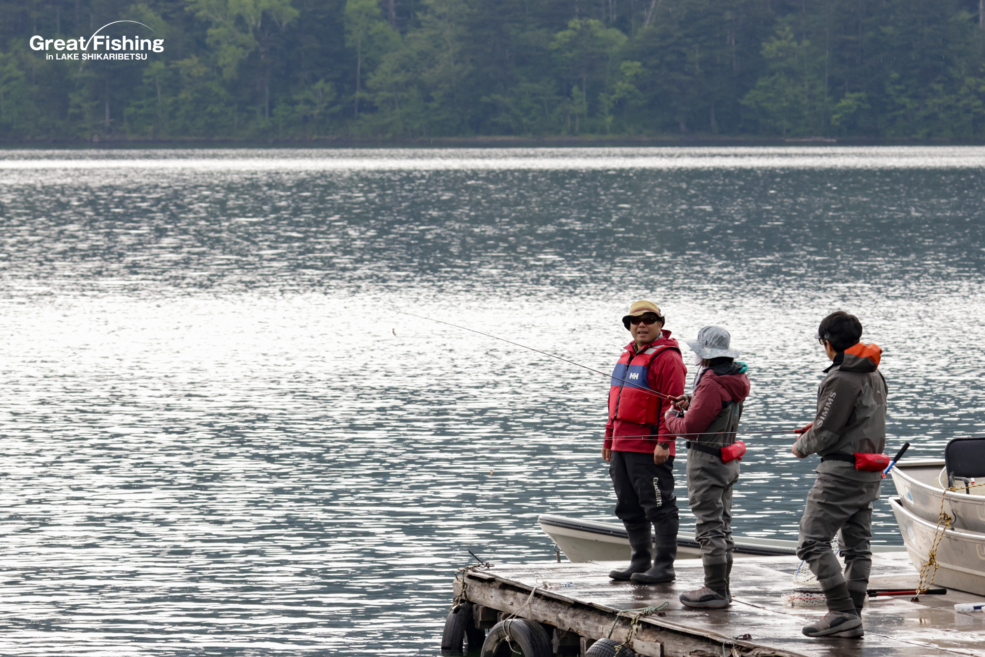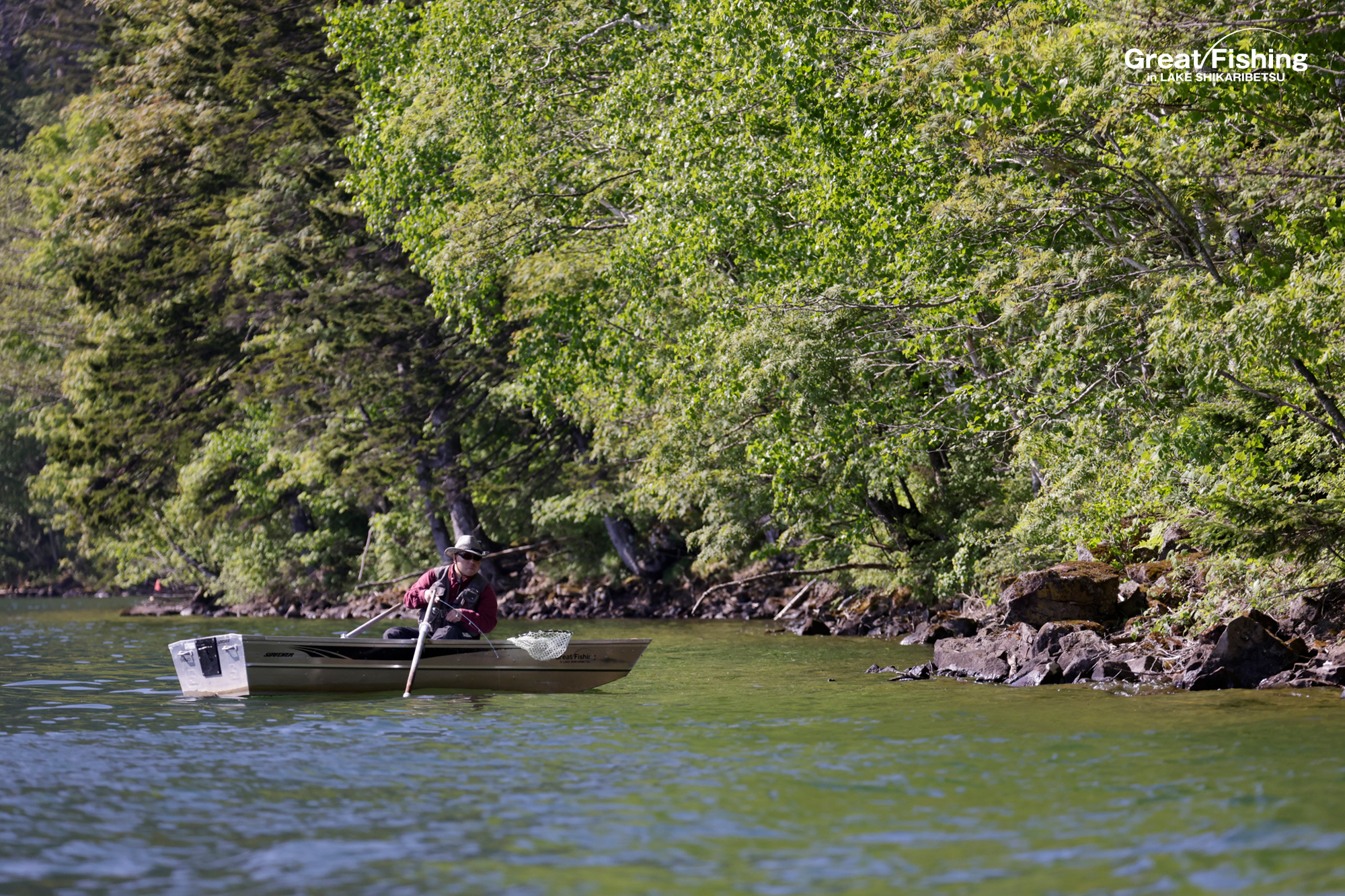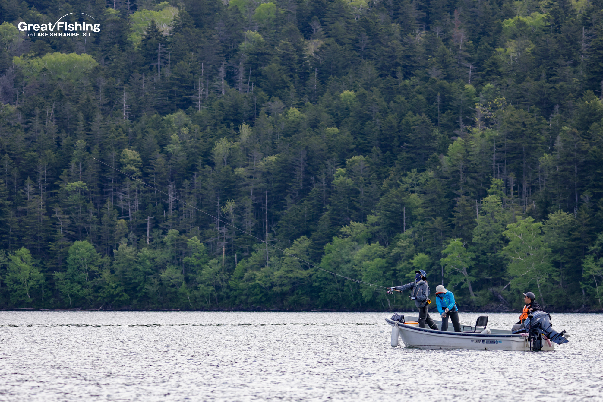 湖中央周辺㉓、虹色岬③とシャクナゲ岬⑦の間等で、スプーン10g(アワビ/パーマーク)を水深1~3mをトローリングでミヤベイワナ(20~33㎝)14匹ヒット(香川さん/芽室町)。境界線中央周辺㉕でスプーン9g(黒/銀)を35秒沈めて水深5m前後をトローリングでミヤベイワナ(28~35㎝)9匹ヒット(上田さん/札幌市)。2の湾沖周辺㉒等でスプーン7g(グリーン/オレンジ)を5~10秒沈めて表層をトローリングでミヤベイワナ(23~40㎝)8匹ヒット(松本さん/三重県)。湖中央周辺㉓㉕等でスプーン13g(白/ピンク)をボートの上からキャスティングし10秒沈めてリトリーブしてミヤベイワナ(30~35㎝)8匹、境界線中央周辺㉕でニジマス(42㎝)1匹ヒット(吉田さん/札幌市)。