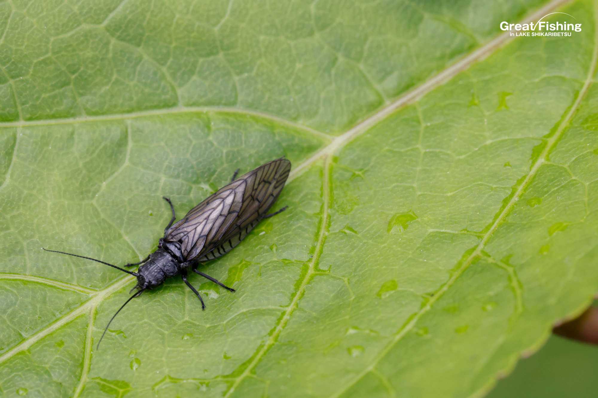 ヘビトンボ目 センブリ科. 大きさ (15mm前後)時期( 6月上旬〜7月)粗い網目模様の大きな翅を持った黒っぽい昆虫。体は幅広で、ずんぐりしている。