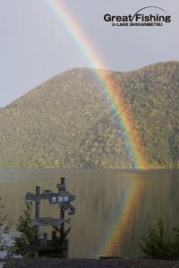 連日の低気温で然別湖の水温が13℃まで下がりました。表面水温12℃〜14℃は今年のファーストステージの釣果がもっとも良かった頃と同じ状況です。今日もかけ上がり周辺では陸生昆虫へのライズがあり、岸際ではワカサギの群れも確認しています。午後のにわか雨の時に然別湖に美しい虹が架かりました。