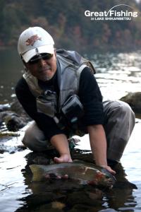 早朝は(水深5m)前後で、良型ミヤベイワナ(35〜40cm)が釣れています。ヒットポイントは、イワナ岬沖、シャクナゲ岬沖など。湯の花岬沖の(水深3m)では(20〜30cm)の小ぶりなミヤベイワナが好調。ヒットルアーは、スピナー7g。うぐいす湾では、小型のサクラマス(20〜25cm)がニンフ(ゴールドビーズヘヤーズイヤー)で連続ヒット。今日の最高釣果は10匹(寺山さん/仙台市)。