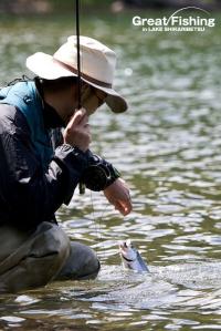 3の湾でミヤベイワナ(25〜40cm)、サクラマス(30〜40cm)が好調。タナは水深2〜4mと浅く、スプーン6.5〜10g(赤金)、(ピンク)などでヒット。音更湾では、ミヤベイワナ(25〜35cm)、サクラマス(30〜42cm)が良く釣れています。大型のサクラマスやニジマスを狙うには、岬の先端部で回遊して来るのをじっくり待つと良いようです。また各湾ではヒットするタナが、0〜10mとかなり違っています。ルアー、フライを引っ張るタナが合っていないと、まったくアタリがありません。そのため1日に1匹しか釣れない人や50匹以上釣れる人など、釣り方によって釣果の差がはっきり出てきています。魚影は非常に濃い然別湖ですが、タナを探ることや、リトリーブのスピード、ルアー(フライ)ローテーションなどその場の状況に対応することが必要です。「アタリは多いがヒットしない・・・」そのような時は釣り方に変化をつけてみてください。