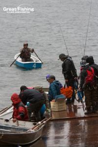 ハーリングの場合、ボートは歩く早さのスピードで移動し、小さなアタリでは合わせを入れず、そのままボートを移動または小刻みにリトリーブ。しばらくして大きなアタリを感じたら、ロッドを立てるように合わせるとフッキング率が上がるようです。今日は全体的に好調で、1人/14〜30匹のミヤベイワナをヒットさせています。今日の最高釣果44匹(廣田さん/東京都)。