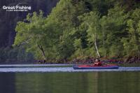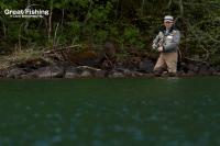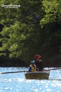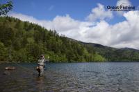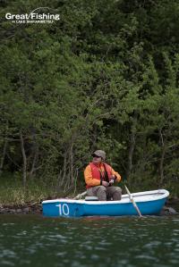 昨夜の大雨が朝方には止み午前6時にファーストステージが開幕。早朝から水深(1〜3m)でミヤベイワナ(25〜45cm)、サクラマス(25〜49cm)が絶好調。ルアー、フライともに非常に良く釣れています。釣果は平均20〜30匹。40匹台が8名、50匹〜60匹が8名、70匹〜90匹が2名、今日の最高釣果は103匹(中村さん/東京都)