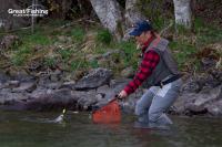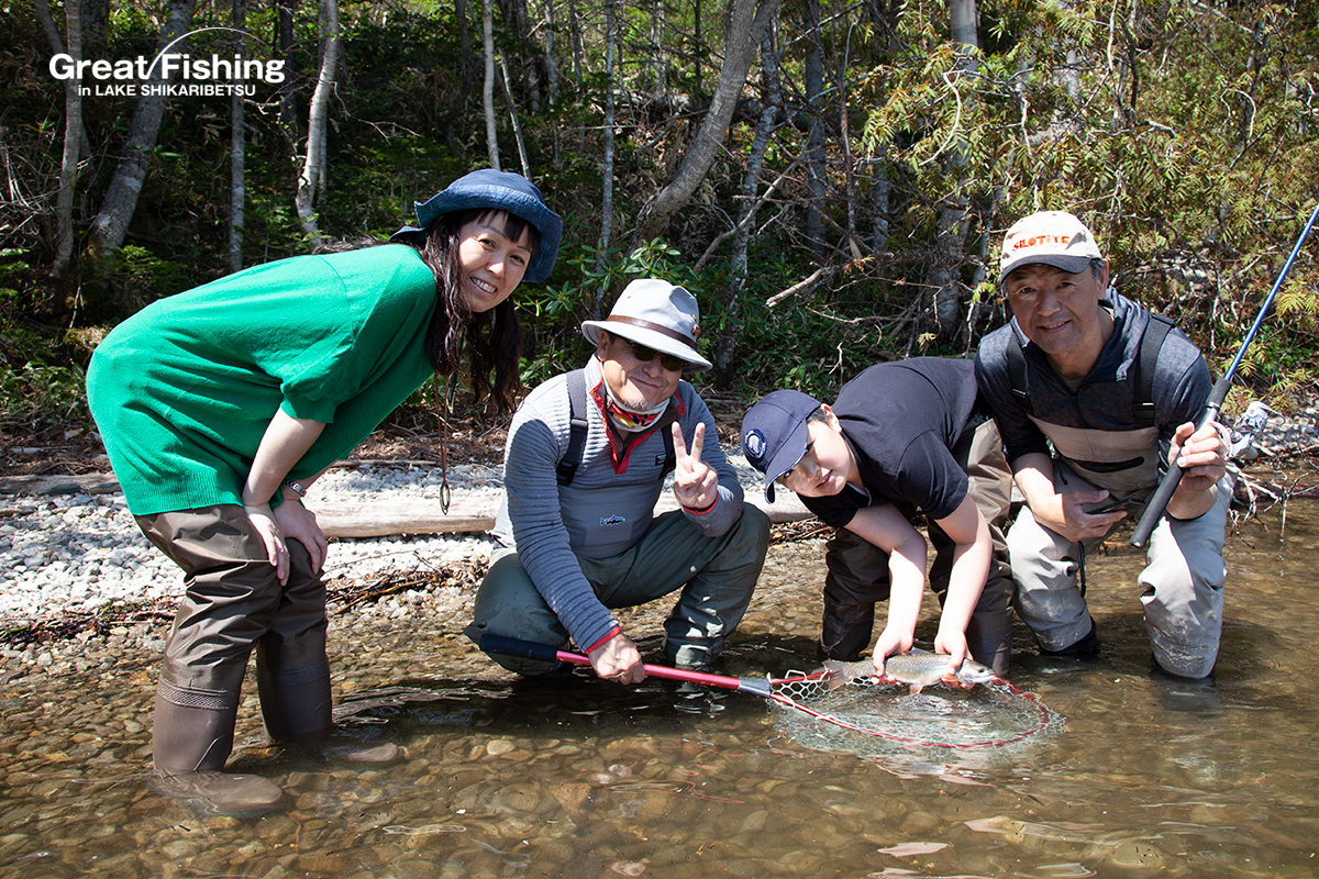 例年に比べて魚のコンディションがよく、アベレージサイズも大きいようで、良型ミヤベイワナ(35m)、良型サクラマス(35cm)、大型ニジマス(40〜50cm)がよく釣れています。全体的な釣果は1人15匹〜30匹前後。