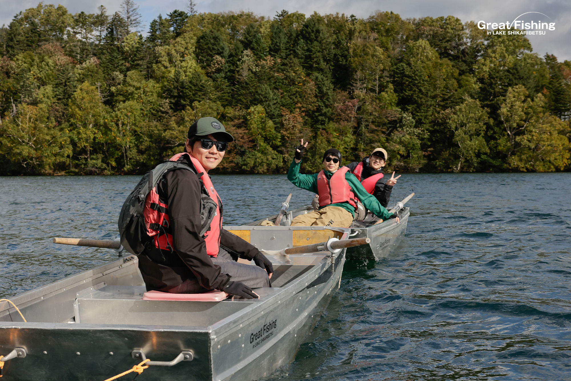 湖中央周辺㉓、境界線中央周辺㉕で(シンキングラインタイプⅦ+ストリーマー(赤/黒))をハーリングしてミヤベイワナ(25~40㎝)4匹、ニジマス(38~45㎝)4匹ヒット(香川さん/芽室町)。