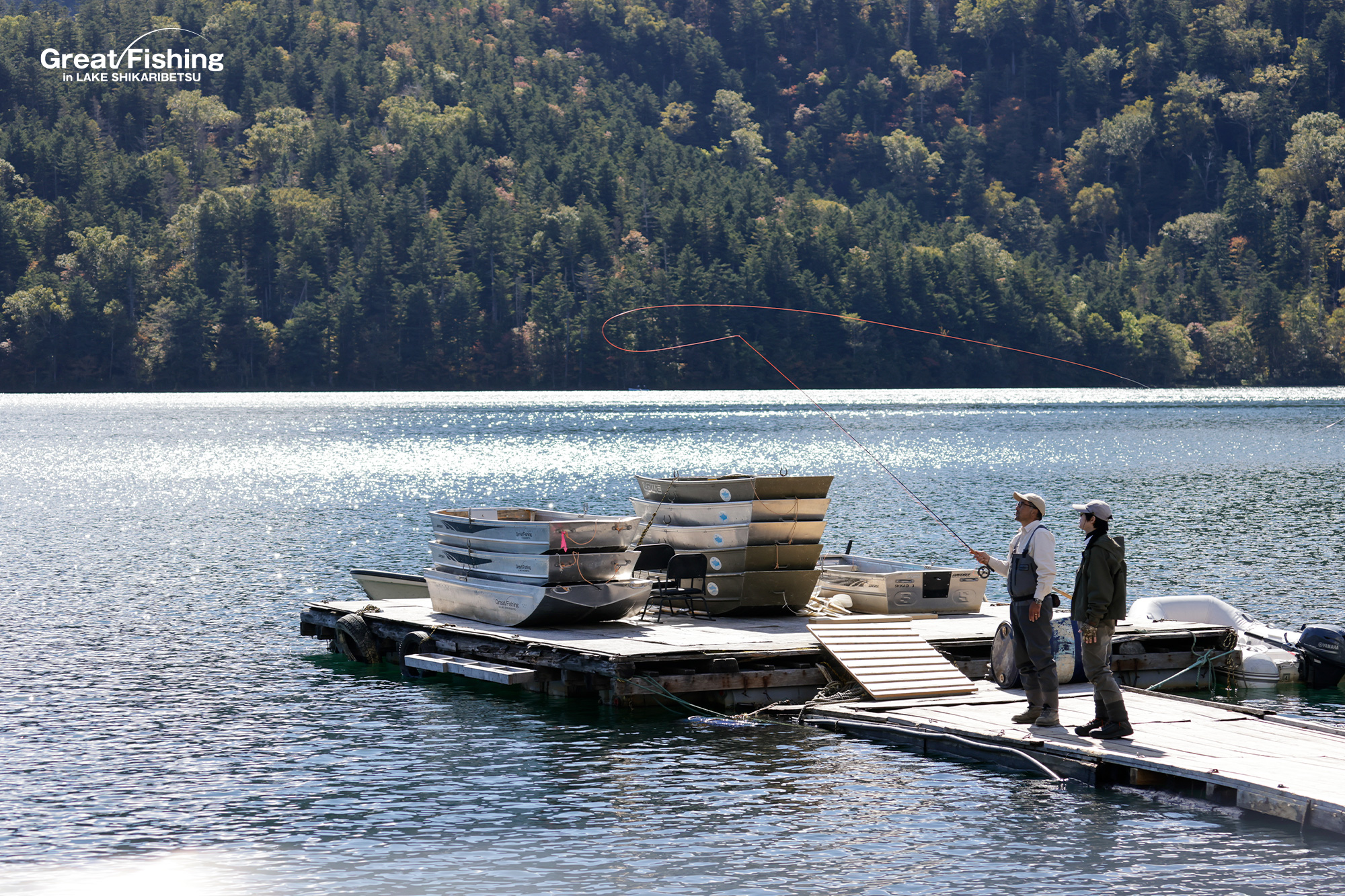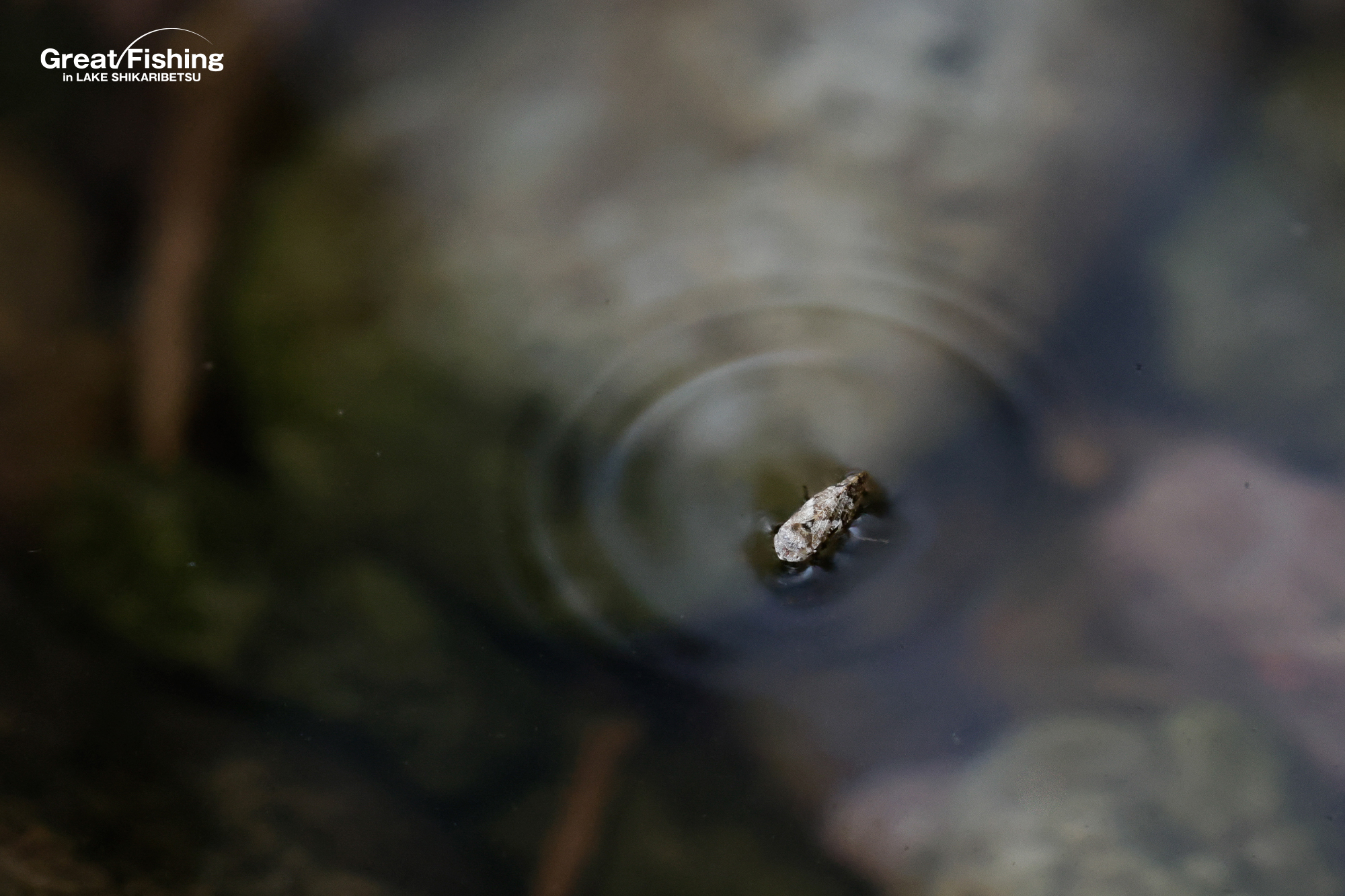 気温が上昇し始める午前10時頃から、約5mmほどのアワフキムシの活動が活発になり、湖面に落下する姿が見られます。ライズを狙う際は、岸際1〜3メートル付近を注意深く観察すると、大型ニジマスのクルージングライズを見つけることができます。
