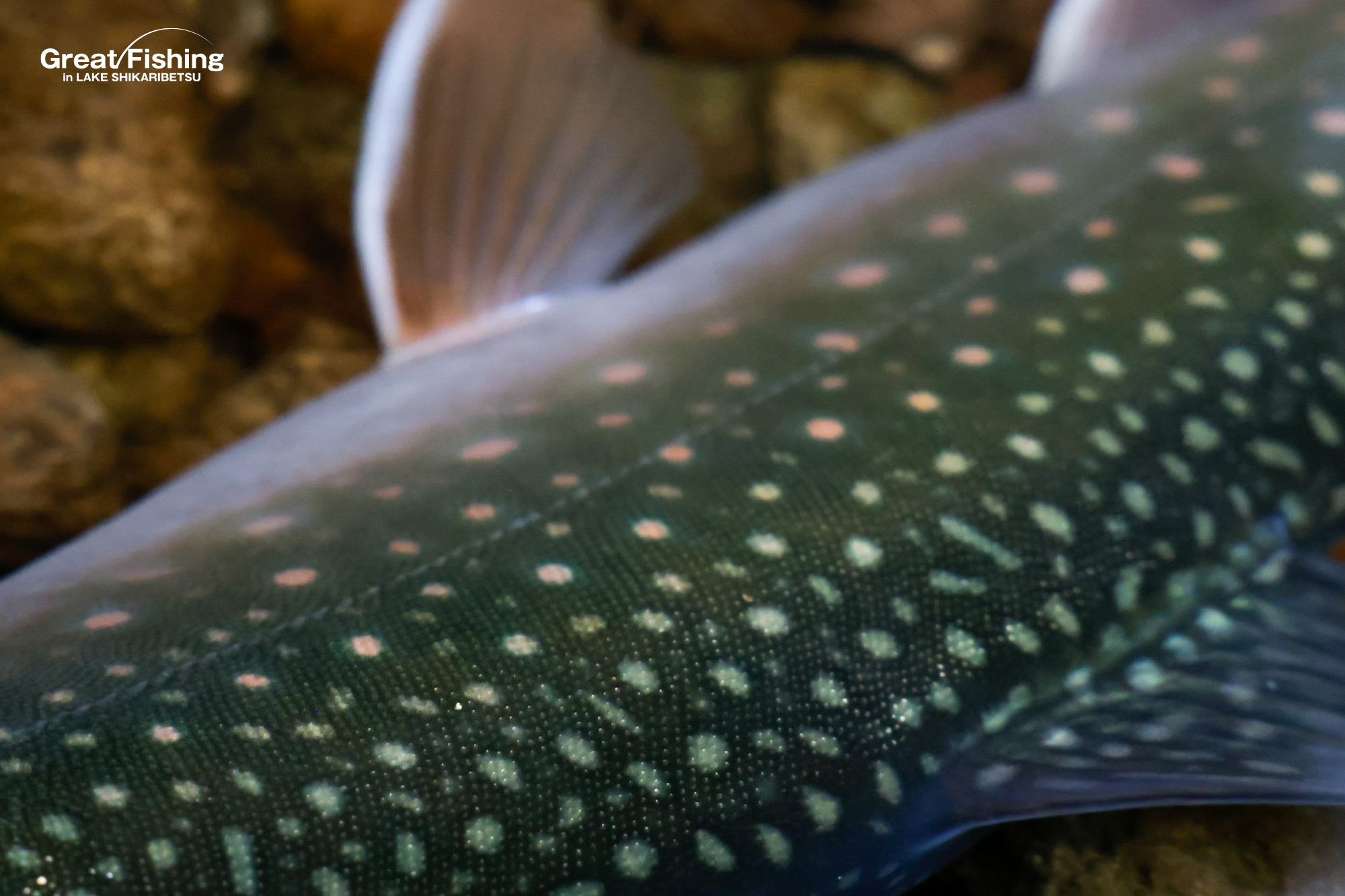 湖中央周辺㉓㉔でスプーン10g(緑)を50秒沈めて水深10mでミヤベイワナ(32㎝、35㎝)2匹ヒット(因さん/札幌市)。
