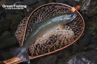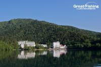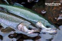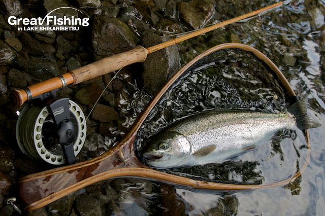 連日大型のミヤベイワナが釣れています。釣れるミヤベイワナのカラーは岸近くではブラウンバックが多く、岸から離れるにしたがいグリーンバックが多いようです。40cmを超えるミヤベイワナはドリーバーデンの様な風格と美しさがあり釣り人の心を惹きつけます。ミヤベイワナのヒットゾーンは水深5〜15mと各ポイントごとに違います。湖中央では10〜15mラインが良く、かけ上がり付近では5〜10mラインが良く釣れています。ニジマス(40〜50cm)は岬周辺かけ上がり水深2〜5mでヒットしています。ニジマス狙いではフライ(ストリーマー)をシンキングラインタイプ4〜6で岬周辺をハーリングすれば効果的。岸釣りのキャスティングではサクラマス(30〜40cm)、ニジマス(30〜52cm)も釣れています。