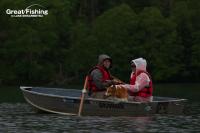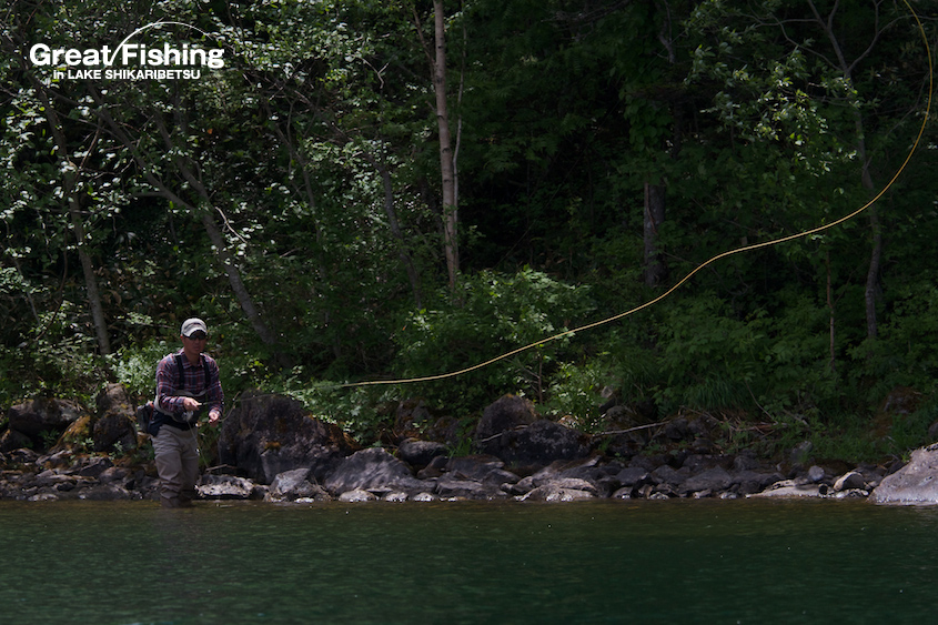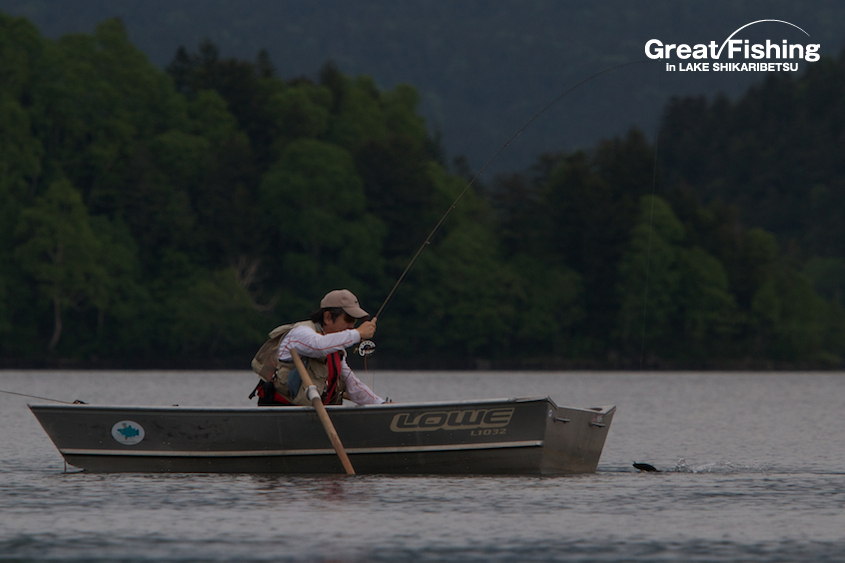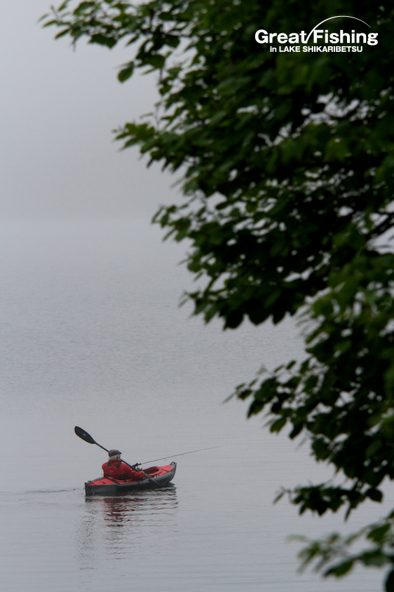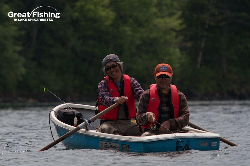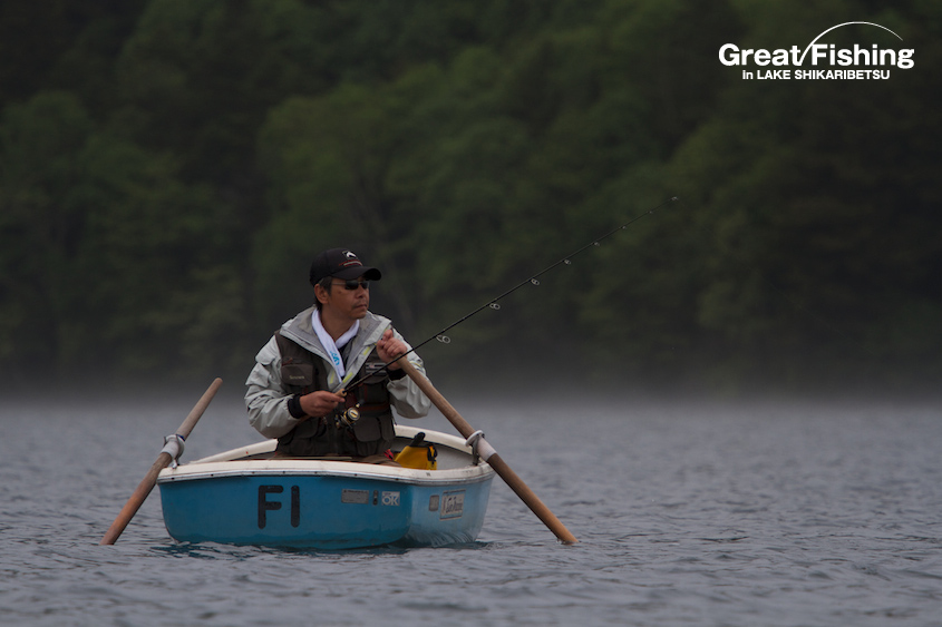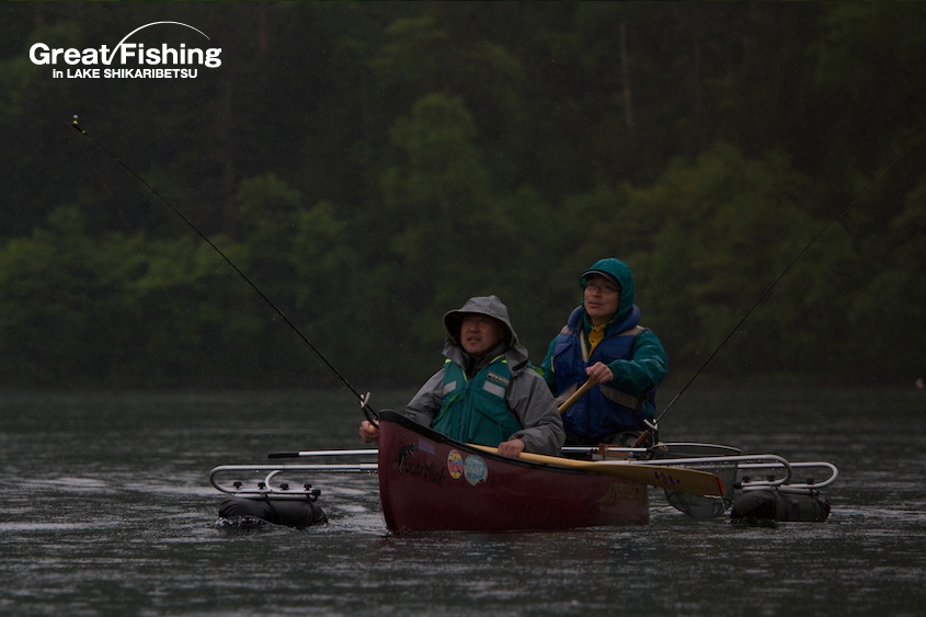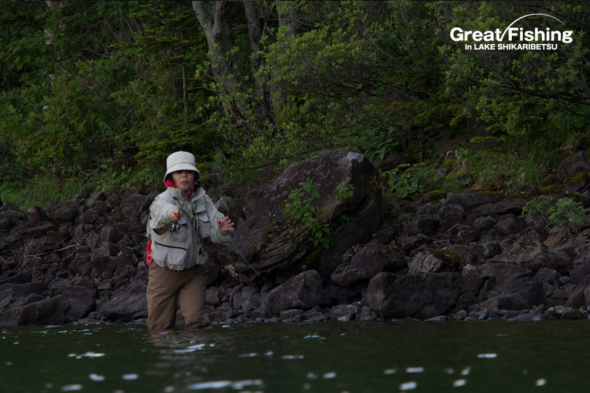ファーストステージ19日目。昨日の夏空から一転、今日は朝からどんより曇り空。1の湾ではフローターを浮かべてニジマスを狙うフライフィッシャー2名が、かけ上がりを丹念に攻めてニジマス(30〜35cm)、サクラマス(25〜30cm)、ミヤベイワナ(20cm)がヒット。シャクナゲ岬先端(6)では、大型ニジマス(42cm)がドライフライ(#8ヒゲナガ)にヒット(篠田さん/横浜市)。音更湾では、ニジマス(35cm)、サクラマス(30〜35cm)、ミヤベイワナ(36cm)がドライフライ(#10エルクヘヤーカディス)にヒット(谷野さん/奈良県)。ミヤベイワナのヒットレンジは、水深(4〜5m)。フライラインはタイプⅥ、ヒットフライはストリーマー(ウーリーバガー/ブラック)。今日の最高釣果は6匹(谷野さん/奈良県)。