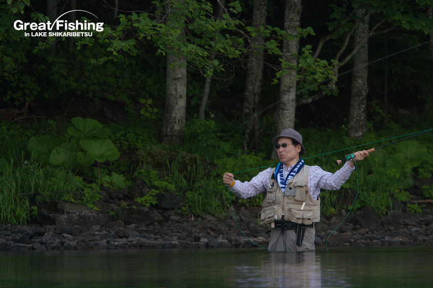 水温の上昇で岸から離れたミヤベイワナを釣るためには、まず当日の泳層(タナ)とポイントを探ります。一番効率の良い方法は、思い出岬沖(15)〜湖中央(18)〜(19)〜(20)をボートでゆっくりトローリングしてアタリ拾います。よくアタリがあるポイントでボートを止めてキャスティング。アタリまたはヒットしたレンジより少し深めにルアー、フライを沈めてスローリトリーブをします。ここで一番重要なことはトローリング速度で、「ゆっくり歩く速さ」をイメージします。早い速度のトローリングは厳禁。ロッド先端から出るラインの角度をしっかり見ながら、狙った水深をトレースするような感じで移動してみましょう。