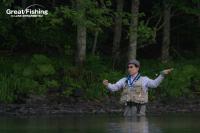 ファーストステージ14日目。午前11時30分頃、音更湾でニジマス(45cm)がドライフライ(#4シケーダー)でヒット(阿部さん/徳島県)。うぐいす湾では(#8エルクヘヤーカディス)で小型サクラマスが連続ヒット(渋澤さん/東京都)。うぐいす湾では、ミヤベイワナ(27cm)グリーンバックがドライフライ(パラシュート/黒・ピーコック)でヒット(松本さん/千葉県)。捕食しているのは陸生昆虫で、モンカゲロウなどのハッチは無し。