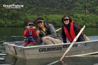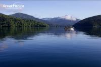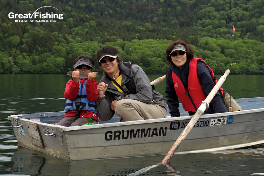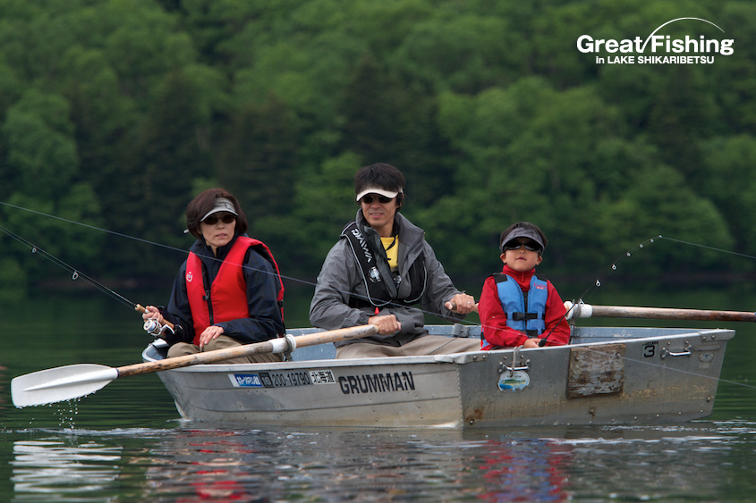 ミヤベイワナ(20〜35cm)は水深(3〜5m)と(約10m)でよく釣れています。好調ポイントは、カルガモ岬沖(5)、湖中央(18)(19)(20)。一人平均の釣果9.3匹、今日の最高釣果は18匹(小林さん/奥尻町)。