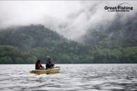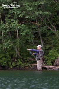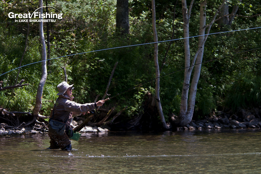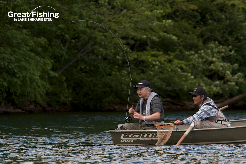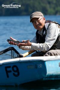 ここ数日間、連続の晴天でミヤベイワナのレンジは深く厳しい状況。今日は早朝のベタ凪から一転、湖中央でやや強い風が吹き、湖面が波立つとミヤベイワナが水深(2〜3m)で連続ヒット(丸尾さん/長崎県)。うぐいす湾では、ドライフライ(#12エルクヘヤーカディス)で、ミヤベイワナ(32cm)がヒット(佐々木さん/神奈川県)。ウェーディングからのスペイキャスティングでは、ニジマス(35cm)、サクラマス(35cm)がヒット(高山さん/神奈川県)。今日の最高釣果は12匹/ワンボート(丸尾さんご夫婦/長崎県)。