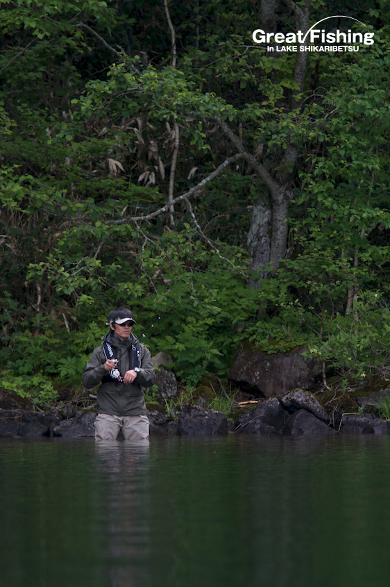 最高気温25℃まで上昇。湖畔ではハルゼミが元気よく鳴いています。砂場ワンド【3】、思い出岬【15】、アイサ岬【13】では、#4シケーダー(セミ)へニジマスが果敢にライズ。2回のバレの後、ニジマス(51cm)がヒット(高橋さん/鹿追町)。受付前の桟橋周辺では大型ニジマスが数匹クルージング。サイトフィッシングでドライフライをキャストしても無反応・・・フライを#14ゴールドビーズヘッドニンフに変えて、魚の目の前に落として誘うようにリトリーブすると大型ニジマス(60cm)がヒット(芳山さん/函館市)。ミヤベイワナは晴天の影響でかなり深場に下がっている様子。早朝から午前10時までの間は、水深(3〜5m)でヒットがありましたがその後はヒット無し。今日の最高釣果は4匹(小林さん/奥尻島)。