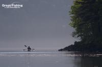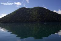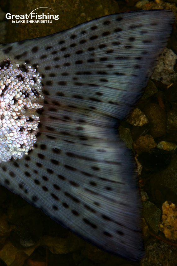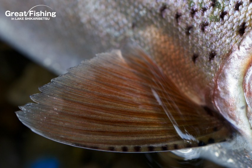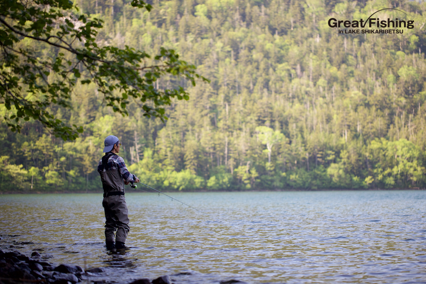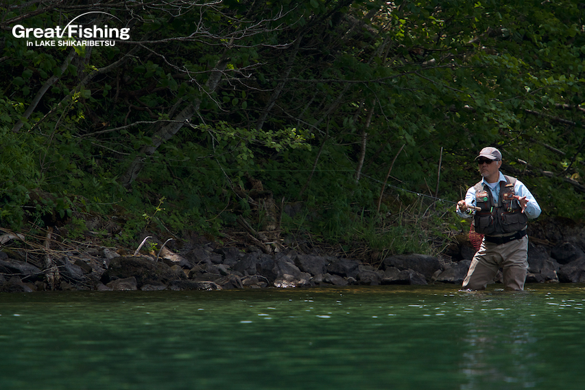 40cm以上の大型ニジマスは1の湾、思い出岬、シャクナゲ岬、虹色岬のかけ上がりで釣れています。ヒットルアーはフローティングミノー5cm、セミルアー。ヒットフライは#10エルクヘヤーカディス。風通しが良い岬周辺または、オーバーハングしている木々の間をピンポイントで狙います。