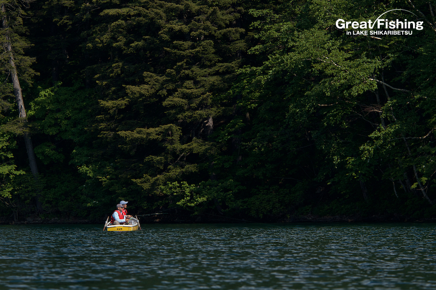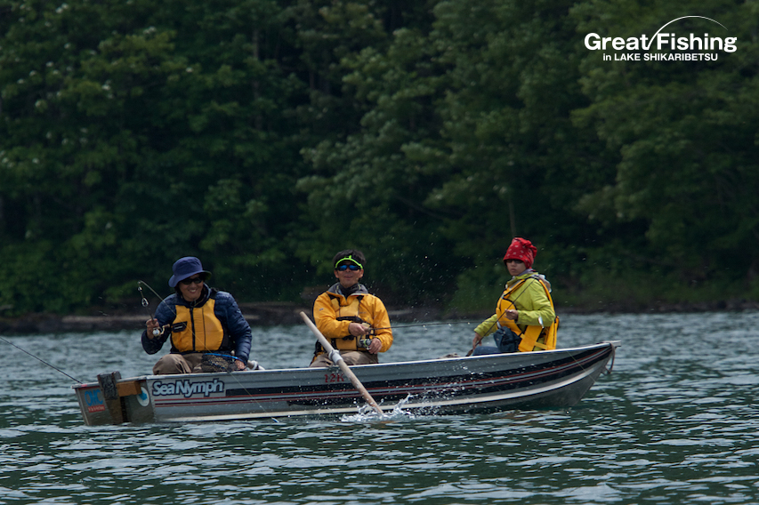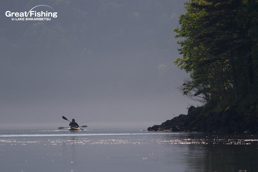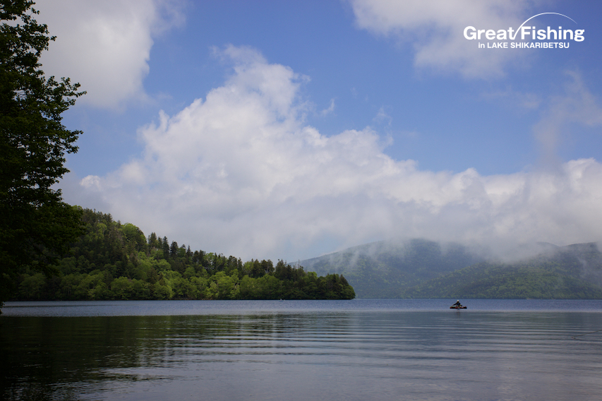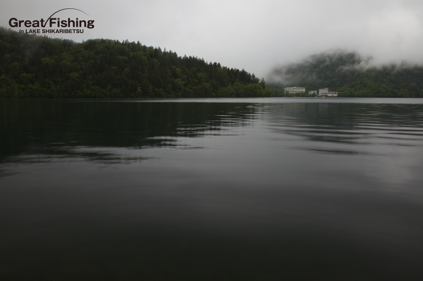 曇り空と霧の影響でミヤベイワナのヒットレンジは浅く水深(2〜4m)。ヒットポイントは湖中央[18][19][20]など。霧が無くなり空が明るくなってからはヒットレンジは深く水深(7〜12m)、さらに深い水深(15〜20m)でも釣れているようです。深場のアタリは弱いのでフックアップさせることが難しいようです。シャクナゲ岬周辺[6]では、ドライフライ(#10モンカゲロウ)でニジマス40cmが2匹ヒット(石川さん/静岡県)。今日の最高釣果は15匹(光永さん/富良野市)。