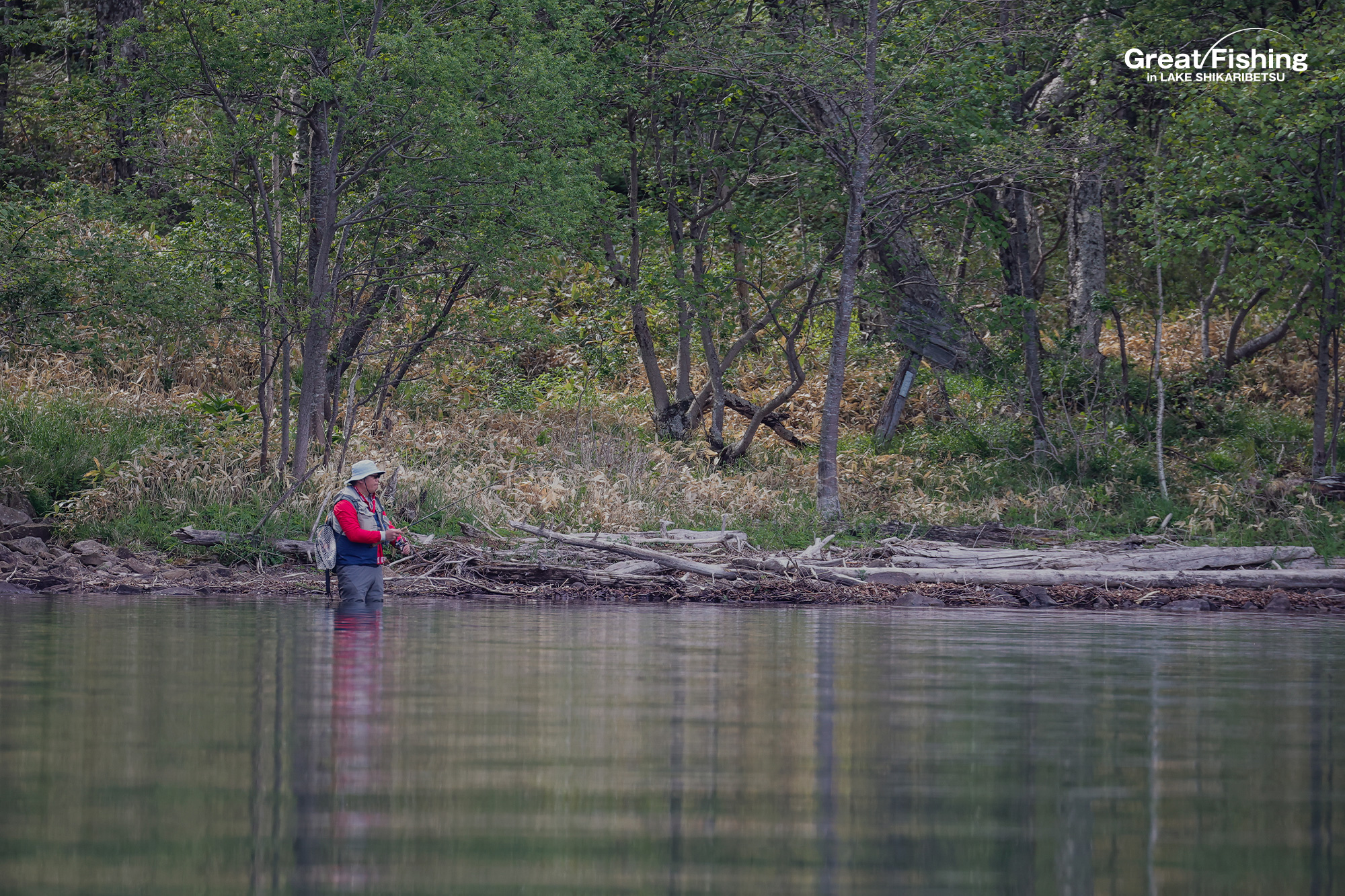 シャクナゲ岬⑦で、大型ニジマス(48cm)が#12ゴールドビースニンフでヒット(加藤さん/札幌市)。湯の花岬⑯でサクラマス(30〜32cm)3匹、虹色岬③で良型ニジマス(38cm)1匹ヒット(山本さん/札幌市)。