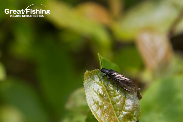 然別湖に生息するセンブリは、幼虫の時は水中に生息し陸上で羽化をする(半水生昆虫)。成虫(体長約15mm)になると水面を飛翔し良くカディスに間違えられるがまったくの別種。かけ上がり周辺でドライフライ(#10〜#12ブラックカディス)や、水面直下をウェットフライ(#10〜#12シルバーマーチブラウン)をリトリーブしてもニジマスがヒットします。