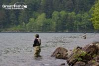 ニジマス狙いの場合、ポイントで待機しライズを待つか、移動しながらライズを見つけること。ライズがある場合、数匹のニジマスが岸寄りし、水面に浮かぶ昆虫類を探しながらクルージングしています。岸釣りの場合はウェーディングはできるだけ浅くするか、立ち込まないように。また、ハッチがある場合、魚たちはセレクティブになっています。できるだけフライをマッチさせた方がヒットします。ライズが無い場合は、大きく目立つ大型ドライフライ(セミ、マドラーミノー)などが有効。湖の透明度が高いので、サイトフィッシングも可能です。