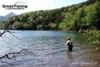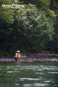 ミヤベイワナの群れは湖中央に集中。その中でも、湯の花岬沖が好調。今日の最高釣果は、ミヤベイワナ(28〜33cm)24匹(山田さん/愛知県)。スプーン10g(ピンク/銀)、水深(5〜10m)。サクラマス(25〜41cm)は、1の湾、うぐいす湾のかけ上がり周辺で釣れていますが少数。大型ニジマスのライズはほとんど無く、ニジマス(30〜35cm)はドライフライ(#12テレストリアル)に少数ヒット。フライ(ストリーマー)では、(30〜44cm)がうぐいす湾、シャクナゲ岬で釣れています。