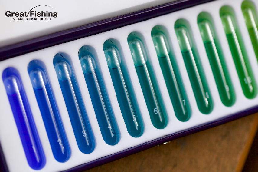湖面などの水面の色を計る際に用いる指標液。液体が、色番号順になっているため、一般に用いる際は水色計(すいしょくけい)とも呼ばれる。 昼間、垂直方向に見た水面を水色と言い、海、湖沼、河川などを、比色測定します。(※)今日現在の然別湖の水色は5番