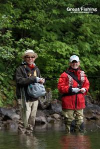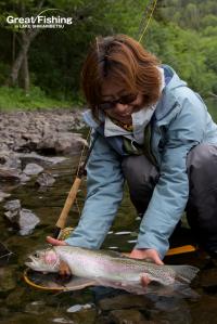 シンキングラインタイプⅣ+#8ウーリーバガー(黒)でかけ上がりをハーリングして良型サクラマス、ニジマス18匹(中川さん/京都府)。音更湾北側岸周辺[10]で大型ニジマス50cmがミノーでヒット(石戸さん/札幌市)。ウェットフライで表層を狙いニジマス16匹。全体的にサクラマス、ニジマスは岸寄りしており、かけ上がりのヒットが増えてきています。今日の最高釣果は18匹(中川さん/京都市)。