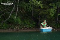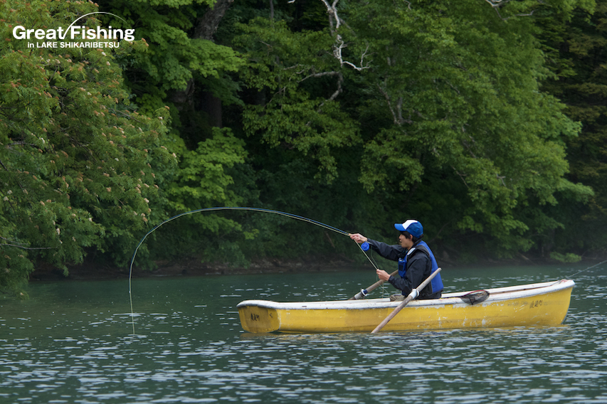 ミヤベイワナのヒットレンジは水深(2〜5m)。今日はショートバイトが多く釣果は低迷。シンキングラインタイプⅢ+ストリーマーでミヤベイワナ(28〜33cm)4匹(田沢さん/札幌市)。ルアー(スプーン7g)で5匹(中里さん/札幌市)など。ミヤベイワナのヒットポイントは湖中央周辺[19]、境界線周辺[12]、アイサ岬周辺[13]など。ドライフライではサクラマス(25〜40cm)、ニジマス(25〜47cm)が釣れています。今日の最高釣果は9匹(神山さん/士幌町)。
