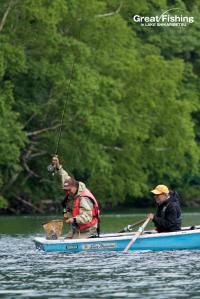 午前中の天気は曇りでミヤベイワナ(30〜40cm)のレンジは浅く3m。午後から晴れ間が広がると水深10mまで深く沈んでいるようです。深場に潜ったミヤベイワナを狙うにはスロースピードのトローリングがベスト。幅広いレンジに対応するためにはルアーのウェイトは(5〜15g)を使い分けます。また深場のアタリは弱いので、ボートスピードに変化をつけて誘うようにフックアップさせるといいでしょう。かけ上がりをシンキングラインタイプⅣ+マラブー(黒)でミヤベイワナのブラウンバック(40cm)が釣れています(松永さん/千葉県)。3の湾では木々がオーバーハングしているポイントをセミルアーで狙いニジマス(45cm)がヒット(大羽さん/帯広市)。今日の最高釣果は(大羽さん/帯広市)