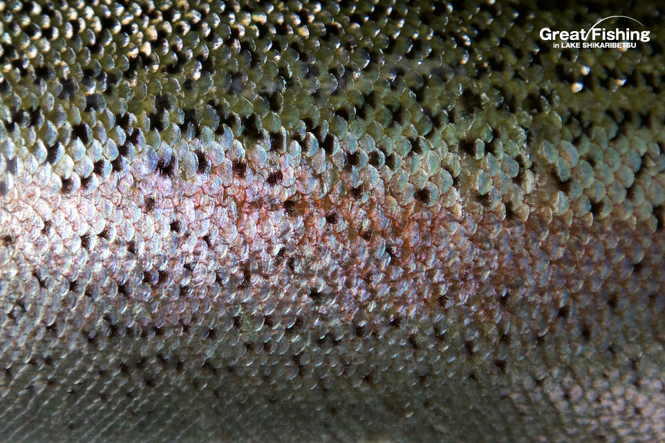 湖中央のポイント⑱、⑲、⑳では、ミヤベイワナ(26〜30cm)6匹と(グリーンバックで黒点が少ない)回遊型の良型ニジマス(35cm)が水深(5m)でヒット(山本さん/江別市)。同じく湖中央では、(スプーン7g/赤・金)を30秒カウントダウン&スローリトリーブで、ミヤベイワナ(30cm)が4匹ヒット(文野さん/東京都)。