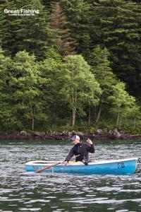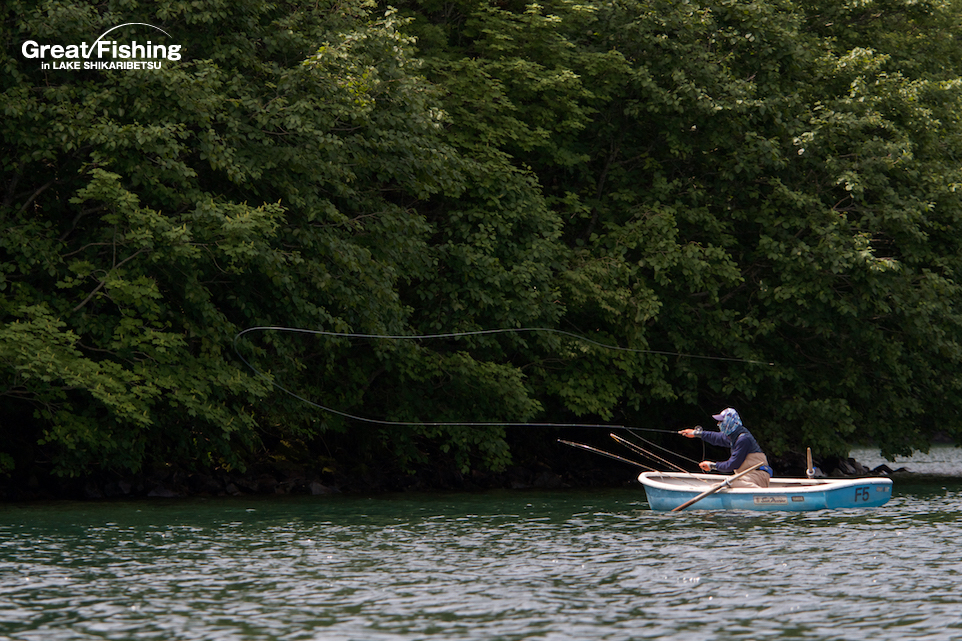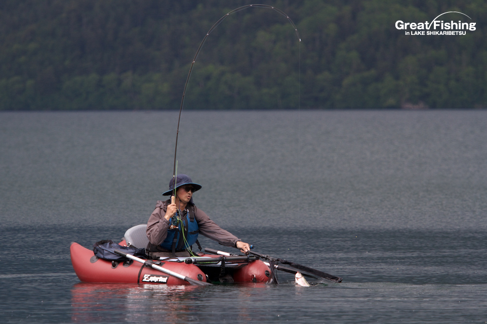 べた凪のポイントでは、ボートからフライまでの距離は15〜20m。風が吹き、湖面にさざ波が立っているポイントの場合は、10m以内でもヒットしています。ボートで効率良くニジマスを狙う方法は、風上から風下へボートが流されるポジションを取り、岸からの距離(10〜15m)を保つように操船ししながら、約5m間隔にドライフライを岸際2m以内へキャストします。パイロットフライは、#8〜#10エルクヘヤーカディスまたはテレストリアル。反応が無い場合は、#12〜#14へサイズダウン。リーダー・ティペットは(3X〜4X)。ヒットさせるために一番大事なことは、一呼吸置いた「遅合わせ」。