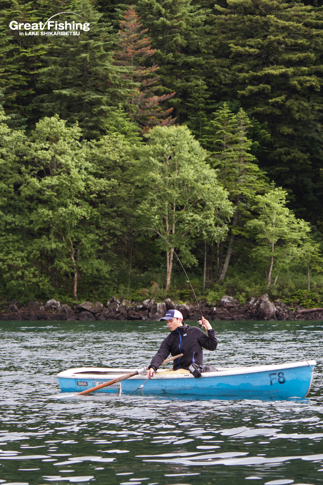 晴天が続き、ミヤベイワナのヒットレンジはさらに深くなってきています。(スプーン18g/金・緑)で、水深(8〜15m)を探り、ミヤベイワナ(25〜38cm)が17匹(2匹がブルーバック)ヒット(喜島さん/千歳市)。(スプーン10g/チャート・シルバー)で、ミヤベイワナ(27〜38cm)が7匹ヒット(牧野さん/小樽市)。(スプーン10g/ピンクシェル)で、ミヤベイワナ(27〜34cm)が6匹ヒット(萩原さん/愛知県)他。
