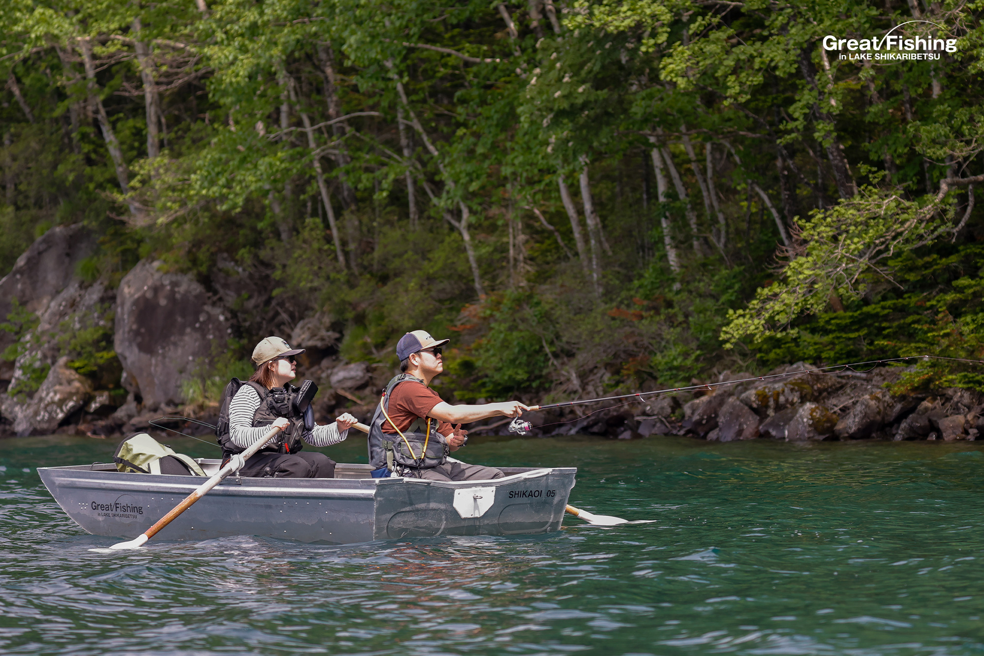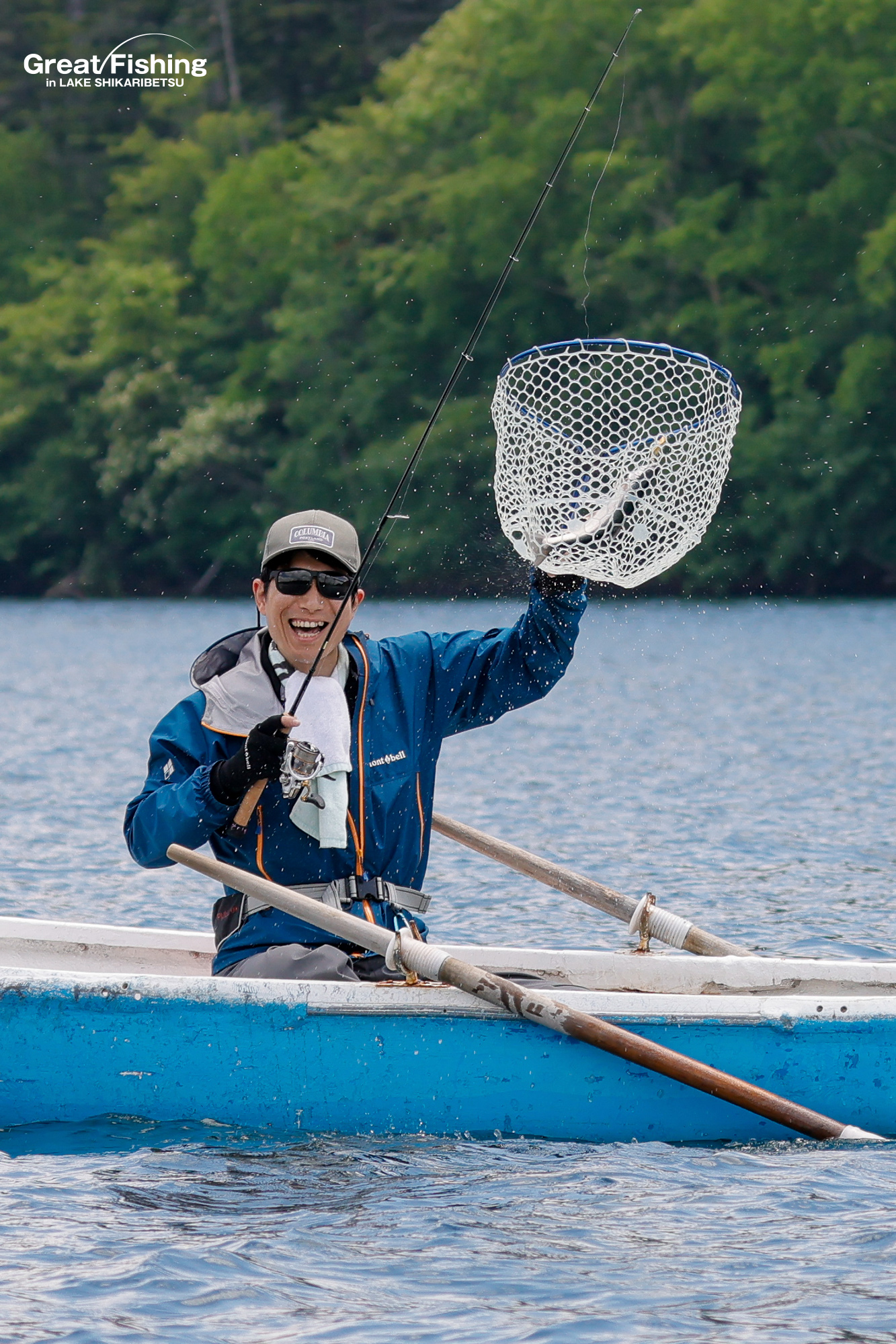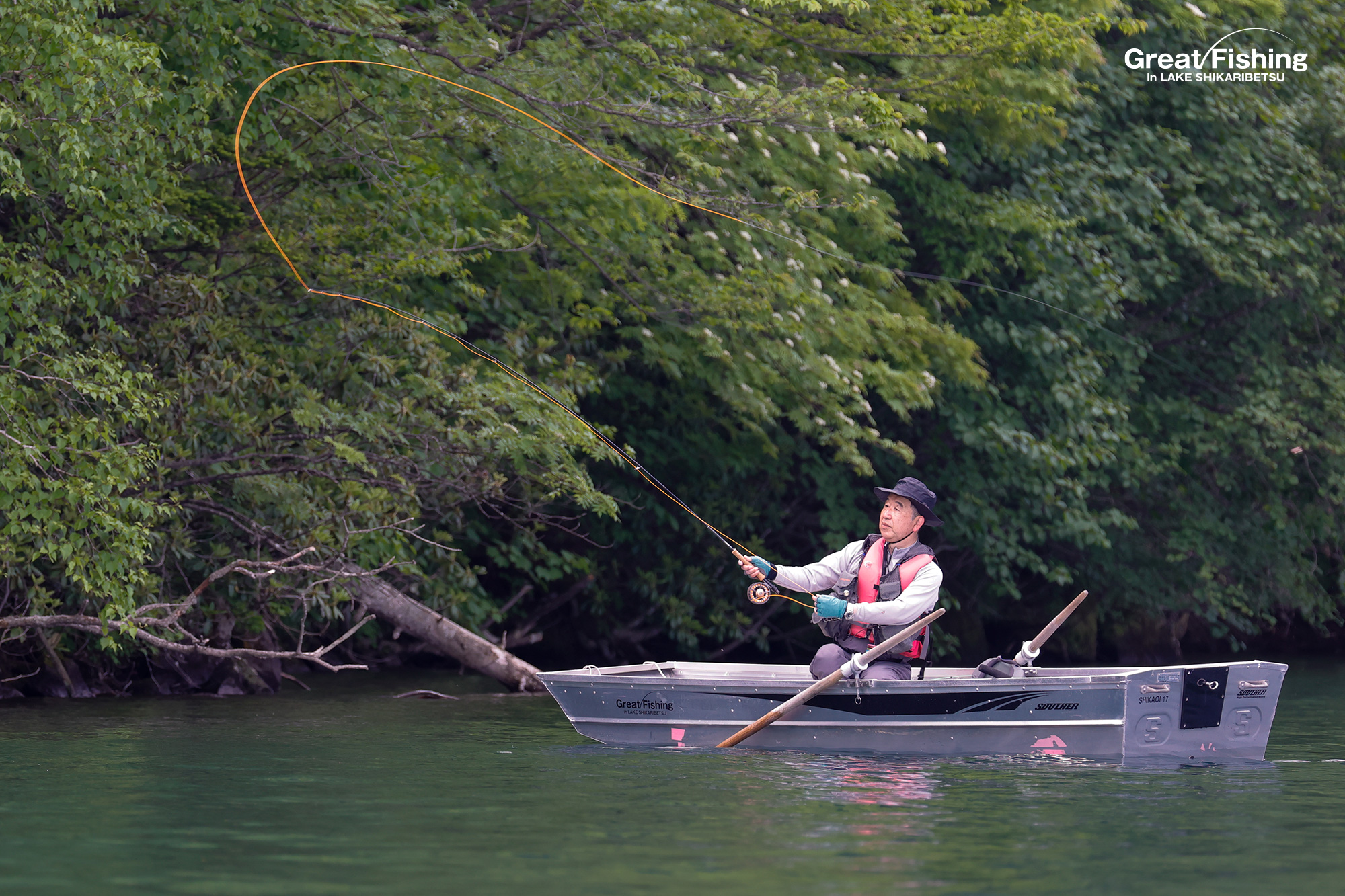 湖中央周辺㉓で、ミヤベイワナ(25〜28cm)4匹、サクラマス(25〜35cm)19匹、回遊型の大型ニジマス(42cm、44cm)2匹が(シンキングラインタイプ6+ストリーマー)でヒット、午後2時頃から思い出岬⑱で複数ライズがあり、ドライフライ(#12ライツロイヤル)で、ニジマス(30〜35cm)6匹ヒット(長嶋さん/横須賀市)。シャクナゲ岬⑦で、ミヤベイワナ(30cm)2匹、更湾南側岸周辺⑧で、ニジマス(38cm)1匹ヒット(平尾さん/網走市)、ヒットルアーはスプーン13g(金)、カウントダウン30〜40秒。
