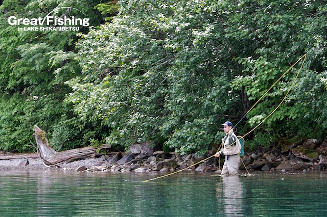 今日の然別湖は、風が弱くべた凪が続きかけ上がり周辺で釣れていたニジマスが影を潜めてしまったようです。岸釣りからのドライフライ、ウェット、ストリーマーともにヒットゾーンは岸から5〜6m以内と近く、湖の透明度も非常に高いので、できるだけ立ち込まないようにした方がいいでしょう。ミヤベイワナはタナを少し上げた様子。水深10m前後で良く釣れています。