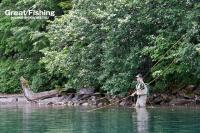 午前の表面水温が19℃で午後になると20℃まで上昇する厳しい状況。ニジマスもかなり深場に移動している様子でした。希にドライフライにも反応するようですが、活性はあまり高くないようです。サクラマス(30〜35m)は水深(1〜3m)の浅いところで連日釣れていますが数は少なめ。ファーストステージ終盤はミヤベイワナ、ニジマスとも深場へ移動して大変釣りづらい状況となっているようです。